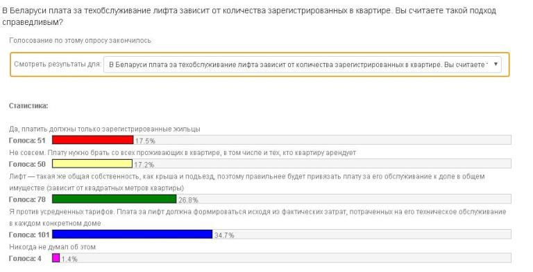В марте – апреле 2016 г. Портал коммунальной грамотности населения проводил опрос «От чего должна зависеть плата за техобслуживание лифта?». Тогда ответ «так как лифт — общая собственность всех проживающих в доме, то и платить за него нужно соразмерно квадратным метрам квартиры» выбрали 17,3 % респондентов. Опрос повторился в июне – июле, и ситуация всего за три месяца изменилась кардинально. Сторонников квадратных метров оказалось уже 26,8 %. Можно предположить, что мнение стало меняться как раз после того, как плату за лифт стали начислять от количества зарегистрированных в квартире жильцов. А если суждение столь непостоянно, значит, вопрос до конца не урегулирован, и стоит еще раз хорошенько подумать перед принятием окончательного решения. Как говорится, семь раз отмерь. Это, кстати, тоже о метрах.